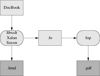 So, first, a stylesheet translates Docbook's structural markup into another dialect of XML — FO (Formatting Objects). FO markup is very much presentation-level; you can think of it as a sort of XML functional equivalent of troff. It has to be translated to Postscript for packaging in a PDF.